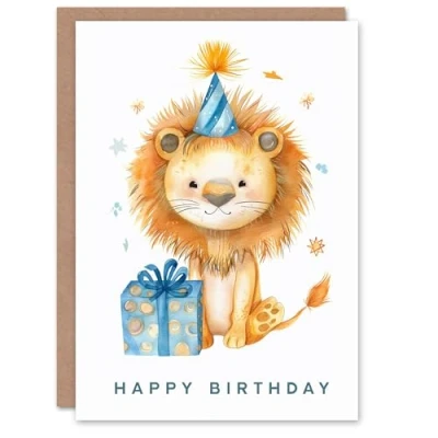 Artery8 Birthday Card Cute Baby Lion Party Hat Illustration For Son Daughter Girl Boy Kids Happy