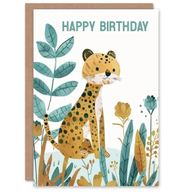 Artery8 Birthday Card Cute Cheetah Jungle Plants Fun Kids Child For Son Daughter Girl Boy Happy