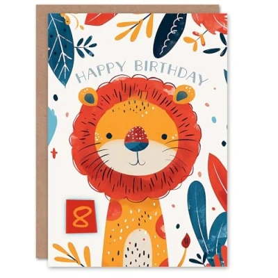 Artery8 Birthday Card Cute Jungle Lion Bright Cartoon Drawing 8th 8 Year Old For Child Kids Son Daughter Greeting