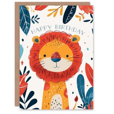 Artery8 Birthday Card Cute Jungle Lion Bright Cartoon Drawing For Child Kids Son Daughter Greeting