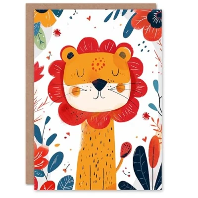 Artery8 Birthday Card Cute Lion Jungle Bright Cartoon Drawing For Child Kids Son Daughter Greeting