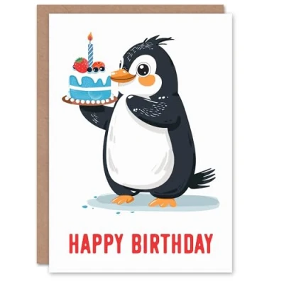 Artery8 Birthday Card Cute Penguin Holding Cake Bright Illustration For Son Daughter Girl Boy Kids Happy