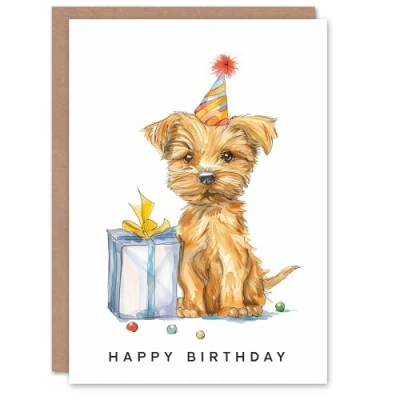 Artery8 Birthday Card Cute Terrier Dog Puppy Party Hat Kids Child For Son Daughter Girl Boy Happy