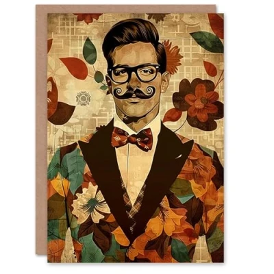 Artery8 Birthday Card Dapper Man Floral Suit Handlebar Moustache For Him Male Dad Brother Son Papa Grandad Greeting