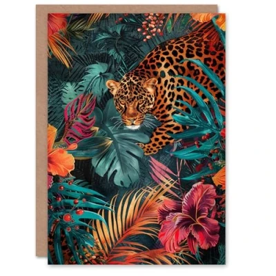 Artery8 Birthday Card Dark Prowling Leopard in Tropical Flowers Jungle Exotic For Her Gran Sister Niece Daughter Wife Woman Greeting