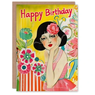 Artery8 Birthday Card Dreamer Florist Flower Lady Colourful Portrait For Her Gran Sister Niece Daughter Wife Woman Greeting