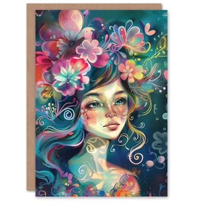 Artery8 Birthday Card Dreamy Flower Fairy Girl Trippy Colourful Portrait For Her Woman Wife Sister Niece Daughter Greeting