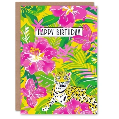 Artery8 Birthday Card Exotic Jungle Leopard in Hot Pink Orchid Flowers Artwork For Her Gran Sister Niece Daughter Wife Woman Greeting