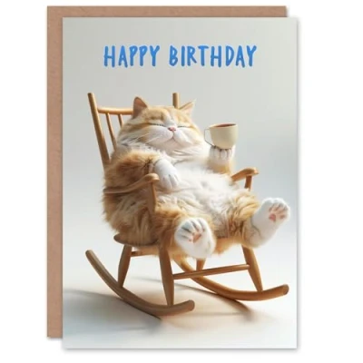 Artery8 Birthday Card Fat Fluffy Cat Lover Rocking Chair Tea For Child Kids Son Daughter Greeting