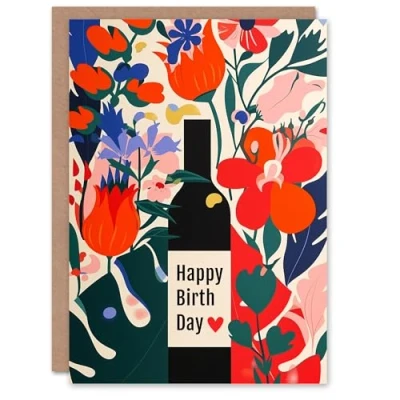 Artery8 Birthday Card Floral Wine Bright Flowers Bottle Bold Design For Her Gran Sister Niece Daughter Wife Woman Greeting