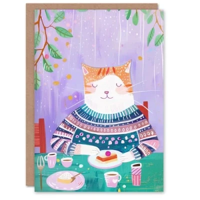 Artery8 Birthday Card Ginger Tabby Cat Lover Cafe Cake Cute For Child Kids Son Daughter Greeting