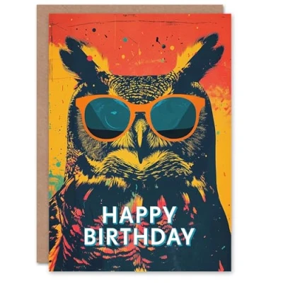 Artery8 Birthday Card Great Horned Owl Sunglasses Colourful Retro For Him Man Male Dad Brother Son Papa Grandad Greeting