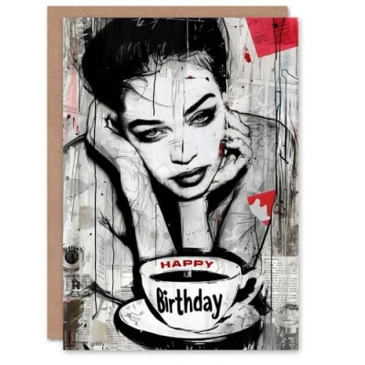 Artery8 Birthday Card Grunge Lady Coffee Collage Portrait Painting For Her Gran Sister Niece Daughter Wife Woman Greeting