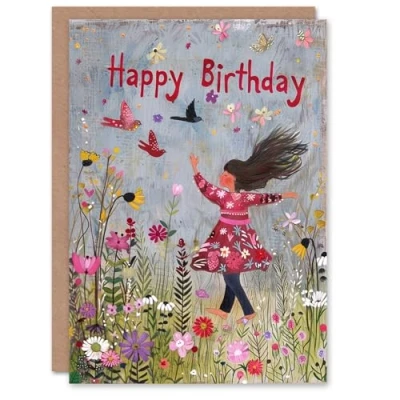 Artery8 Birthday Card Happy Child Dancing in Spring Flower Meadow For Her Gran Sister Niece Daughter Wife Woman Greeting