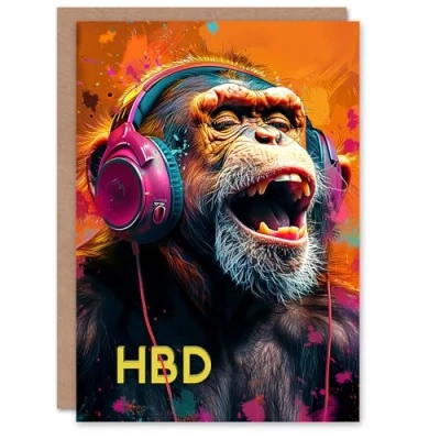 Artery8 Birthday Card Happy Chimp Funky Music Headphones HBD For Him Man Male Dad Brother Son Papa Grandad Greeting
