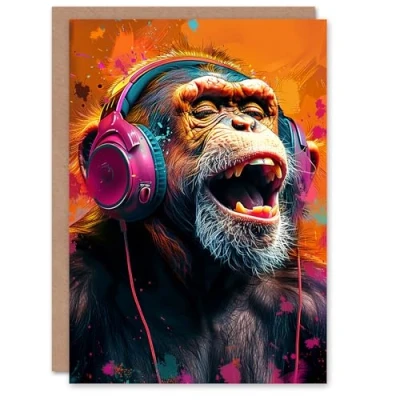 Artery8 Birthday Card Happy Chimp with Headphones Funky Music For Him Man Male Dad Brother Son Papa Grandad Greeting