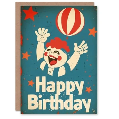 Artery8 Birthday Card Happy Clown Balloon Stars Vintage Advert For Him Man Male Dad Brother Son Papa Grandad Greeting