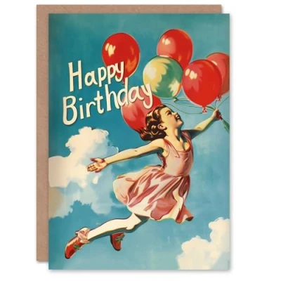 Artery8 Birthday Card Happy Flying Balloon Girl Retro Painting For Her Gran Sister Niece Daughter Wife Woman Greeting