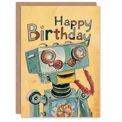 Artery8 Birthday Card Happy Retro Robot Watercolour Painting For Child Kids Son Daughter Greeting