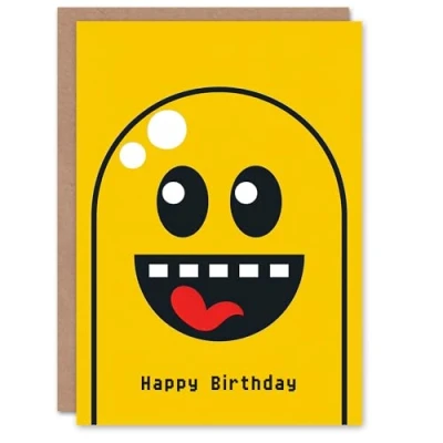 Artery8 Birthday Card Happy Yellow Ghost Retro Video Game Style For Child Kids Son Daughter Greeting