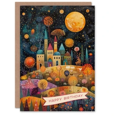Artery8 Birthday Card Hilltop City Full Moon Stars Colourful Folk Art For Her Gran Sister Niece Daughter Wife Woman Greeting