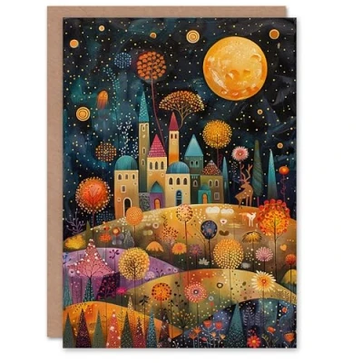 Artery8 Birthday Card Hilltop City Stars Full Moon Colourful Folk Art For Her Gran Sister Niece Daughter Wife Woman Greeting