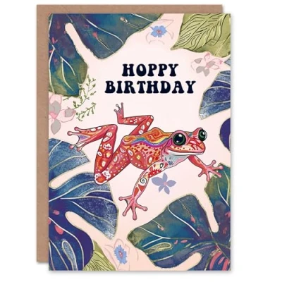 Artery8 Birthday Card Hoppy Colourful Jungle Frog Bright Folk Art For Her Gran Sister Niece Daughter Wife Woman Greeting