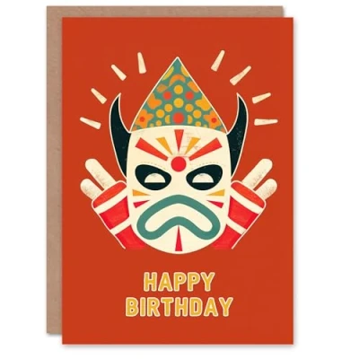 Artery8 Birthday Card Japanese Angry Mask Bold Orange Design For Him Man Male Dad Brother Son Papa Grandad Greeting