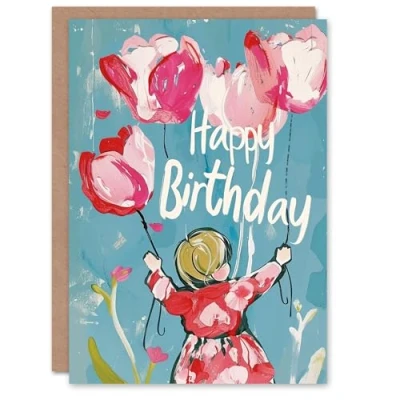 Artery8 Birthday Card Little Girl Tulip Balloons Painting Happy Bright Joy For Her Gran Sister Niece Daughter Wife Woman Greeting