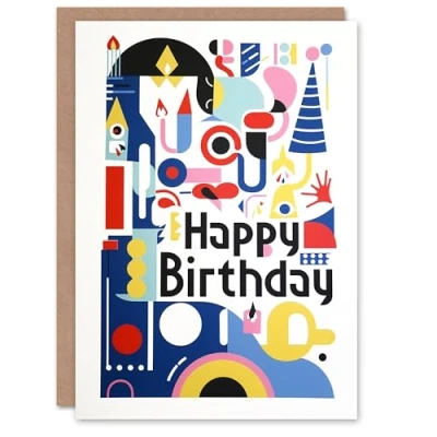 Artery8 Birthday Card Modern Abstract Party Hat Candles Fun Shapes For Him Man Male Dad Brother Son Papa Grandad Greeting