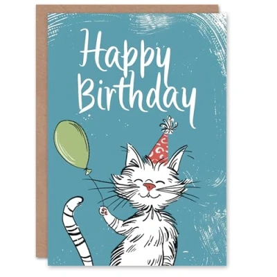 Artery8 Birthday Card Party Hat Kitty with Balloon Cat Lover Cartoon For Child Kids Greeting
