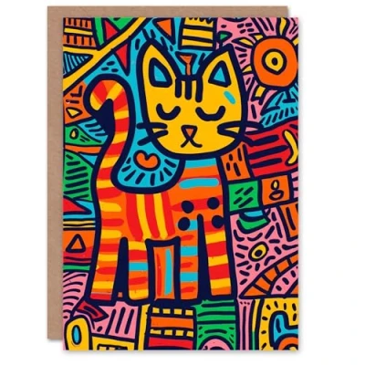 Artery8 Birthday Card Pet Cat Lover Colourful Folk Art Pattern For Son Daughter Girl Boy Kids Happy
