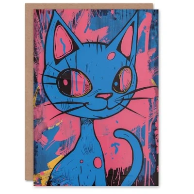 Artery8 Birthday Card Pink Blue Art Cat Painting Abstract Punk Blank Arty All Occasion Greeting