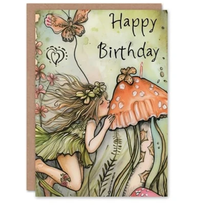 Artery8 Birthday Card Pixie Fairy Mushroom Butterfly Illustration For Her Gran Sister Niece Daughter Wife Woman Greeting