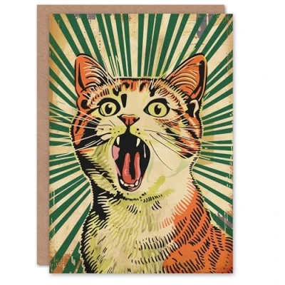 Artery8 Birthday Card Pop Art Cat Scream Fun Green Stripes Bold Blank Arty All Occasion Greeting