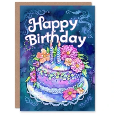 Artery8 Birthday Card Purple Cake Candles Flowers Watercolour For Her Gran Sister Niece Daughter Wife Woman Greeting