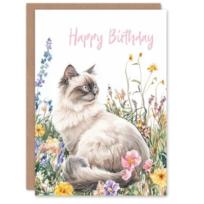 Artery8 Birthday Card Ragdoll Cat Lover Pet and Wildflowers Watercolour Blank For Him Or Her Art Greeting