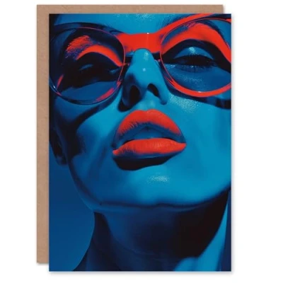 Artery8 Birthday Card Red Lipstick and Glasses Blue Lady Portrait For Her Gran Sister Niece Daughter Wife Woman Greeting