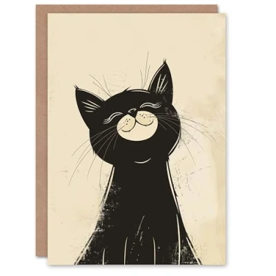 Artery8 Birthday Card Retro Cartoon Cute Smiling Black Kitty Cat Lover Blank Arty Art All Occasion Greeting