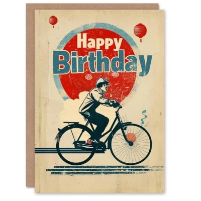 Artery8 Birthday Card Retro Chinese Bicycle Lantern Drawing For Him Man Male Dad Brother Son Papa Grandad Greeting