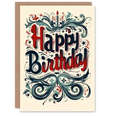 Artery8 Birthday Card Retro Style Blue Red Filigree Pattern Design Blank Arty Art All Occasion Greeting