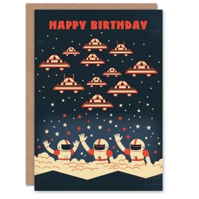 Artery8 Birthday Card Spaceships Astronaut Space Video Game Style For Child Kids Son Daughter Greeting