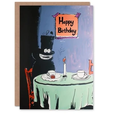 Artery8 Birthday Card Spooky Cheshire Cat Grin Tea Party Drawing For Him Man Male Dad Brother Son Papa Grandad Greeting