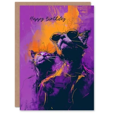 Artery8 Birthday Card Street Cats Lover Sunglasses Purple Orange Design For Him Man Male Dad Brother Son Papa Grandad Greeting