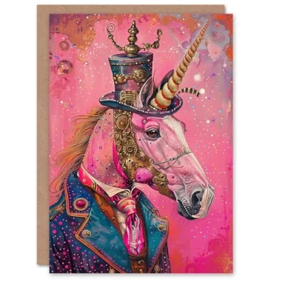 Artery8 Birthday Card Stylish Pink Steampunk Unicorn Top Hat Suit Kids For Son Daughter Girl Boy Happy