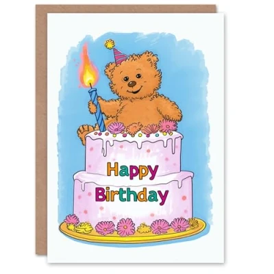 Artery8 Birthday Card Teddy Bear Cake Party Hat Cartoon Cute For Child Kids Son Daughter Greeting
