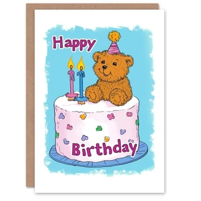 Artery8 Birthday Card Teddy Bear Cake Party Hat Cute Cartoon For Child Kids Son Daughter Greeting