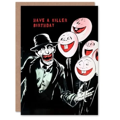 Artery8 Birthday Card Weird Creepy Man with Balloons Killer Drawing For Him Male Dad Brother Son Papa Grandad Greeting
