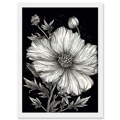 Artery8 Black and White Cosmos Flower Starry Night Sky Artwork Framed Wall Art Print A4