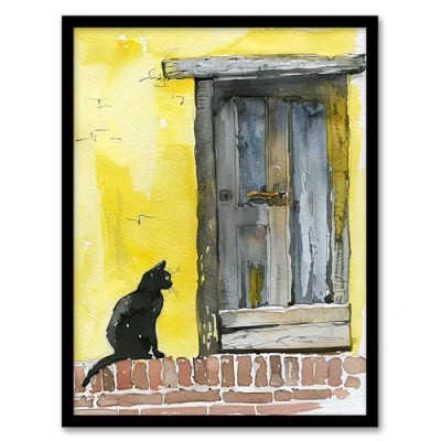 Artery8 Black Cat Lover Village House Door Watercolour Living Room Artwork Framed Wall Art Print A4